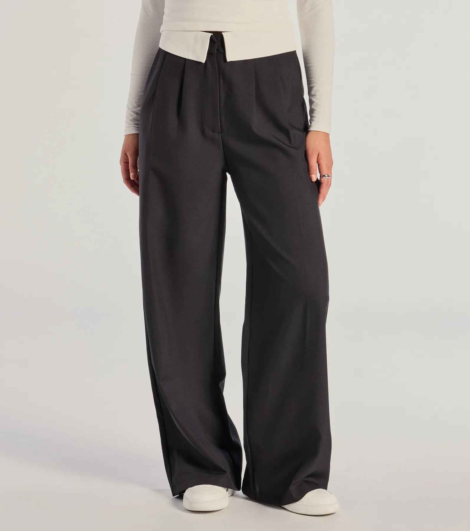 • Contrast-hued foldover waist accent